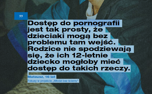 "Dostęp do pornografii jest tak prosty, że dzieciaki mogą bez problemu tam wejść. Rodzice nie spodziewają się, że ich 12-letnie dziecko mogłoby mieć dostęp do takich rzeczy…" – mówi jeden z młodych ludzi cytowany w raporcie.