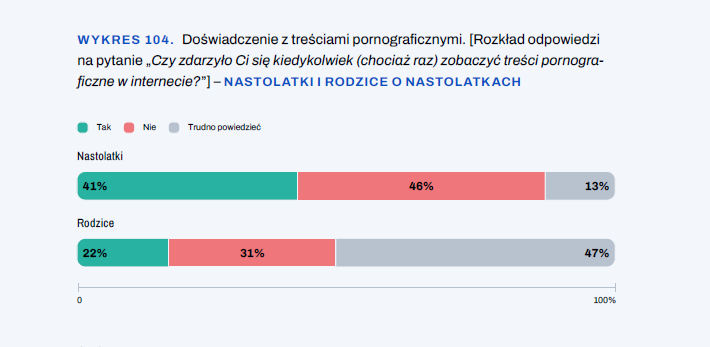 - Ponad 40 proc. nastolatków deklaruje, że miało styczność z materiałami pornograficznymi w sieci przynajmniej raz. Autorzy raportu zwracają jednak uwagę na 13 proc. respondentów, którzy wybrali odpowiedź "trudno powiedzieć". Podkreślają, że może to świadczyć o niepewności co do definicji takich treści, braku jednoznacznych wspomnień lub dyskomforcie związanym z udzieleniem jednoznacznej odpowiedzi.